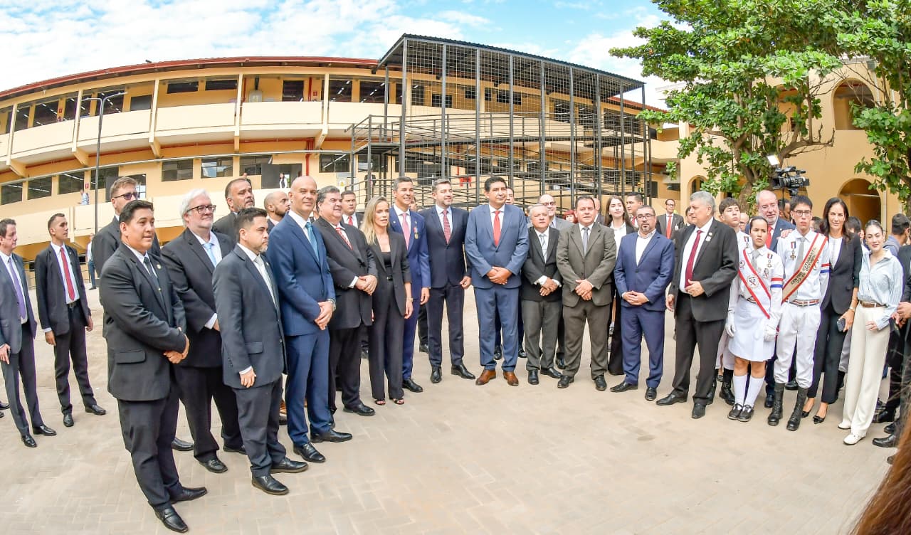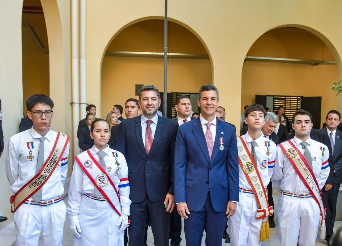 En un acto cargado de patriotismo y compromiso con la educación pública, el Presidente de la República, Santiago Peña, junto al Vicepresidente Pedro Alliana, encabezaron la inauguración de las obras de reconstrucción, restauración y reforma integral del Colegio Nacional de la Capital «Gral. Bernardino Caballero» (CNC).